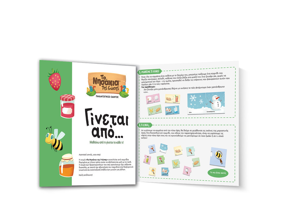 Από τι γίνεται το μέλι; Από πού βγαίνει το λάδι; Τι άλλο μπορώ να φτιάξω με το ίδιο υλικό; Ένωσε τις εικόνες μεταξύ τους και μάθε από τι παράγονται τα προϊόντα που χρησιμοποιούμε καθημερινά! Περιέχει και εκπαιδευτική χειροτεχνία, με την οποία τα παιδιά ζωγραφίζοντας μαθαίνουν τα αντικείμενα του παιχνιδιού!