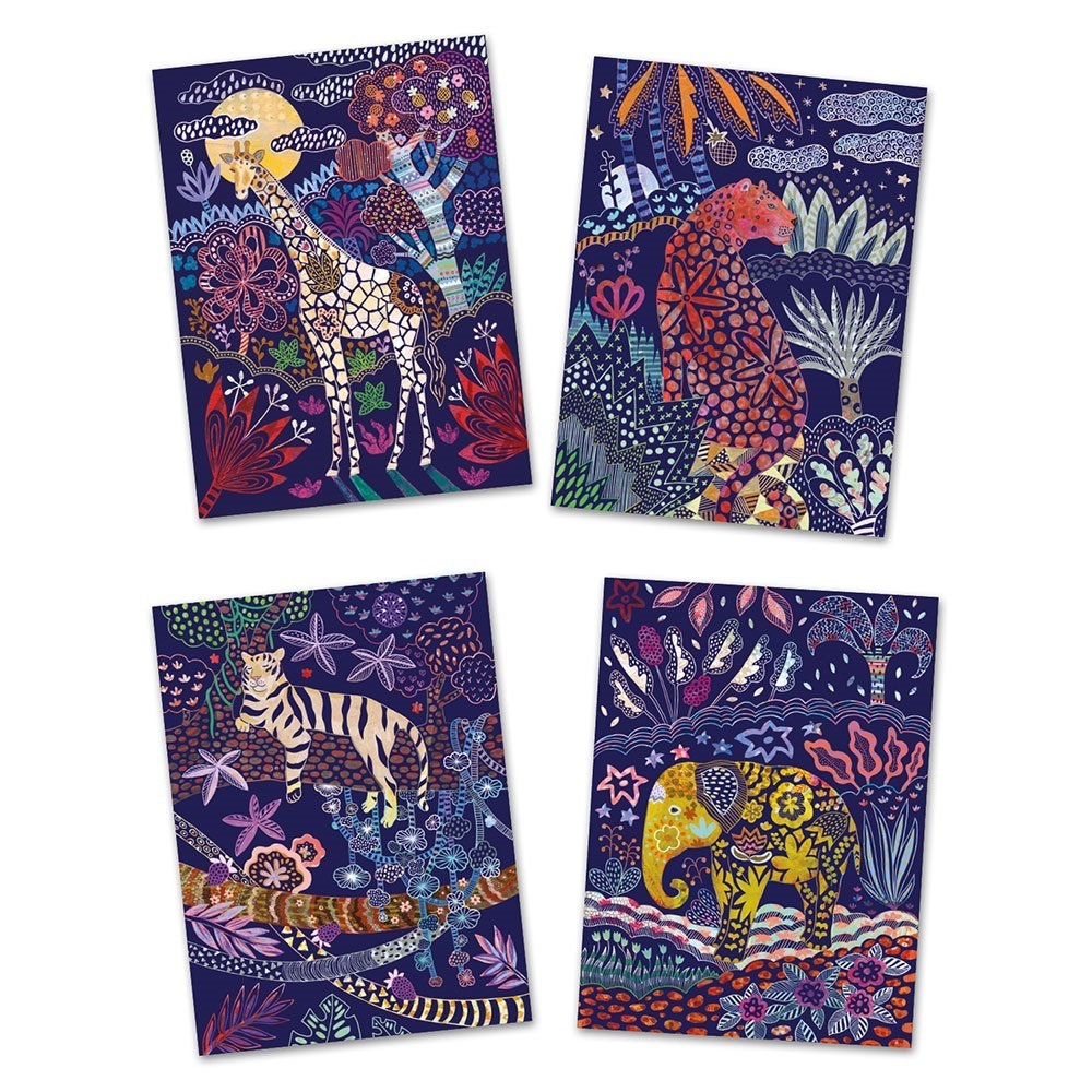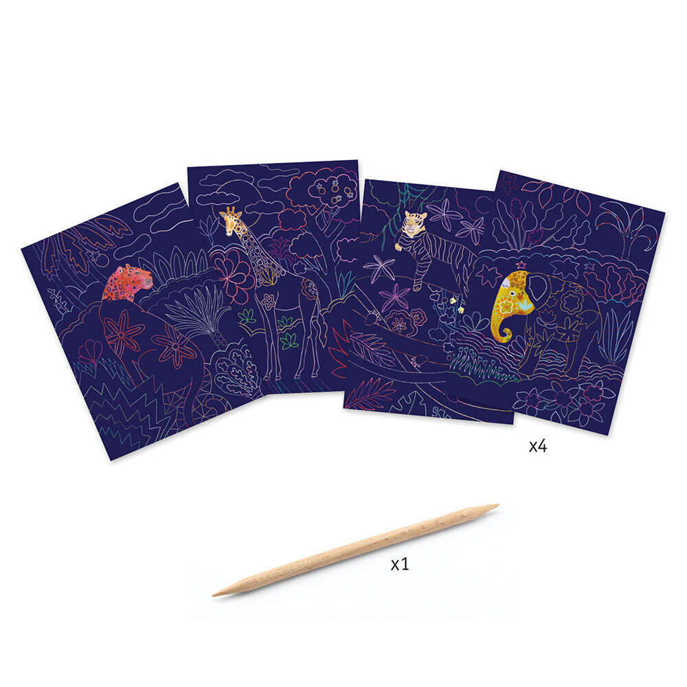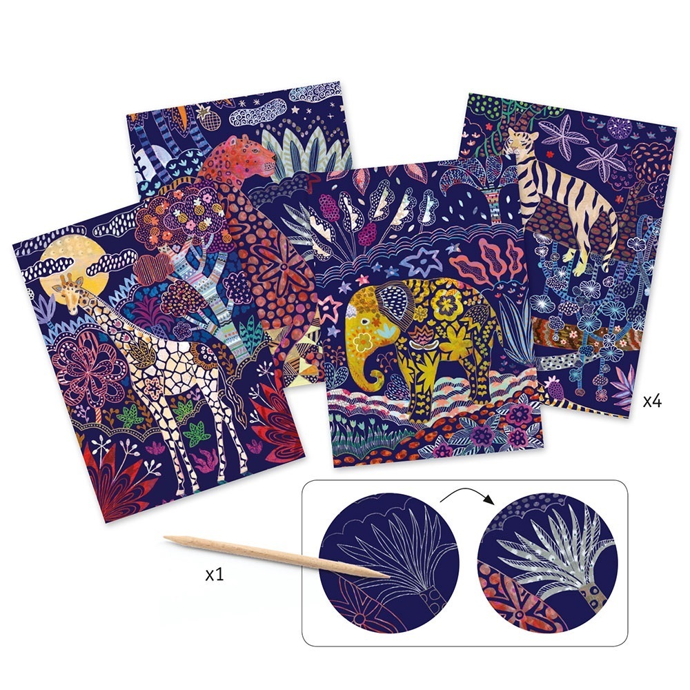 Ξύστε την εικόνα και ανακαλύψτε άγρια ζώα με περίεργα μοτίβα με τις πρωτότυπες χειροτεχνίες της εταιρείας Djeco! Ξύνοντας την εικόνα με το ειδικό στυλό σε συγκεκριμένα σημεία, αποκαλύπτουμε τα χρώματα που κρύβονται από κάτω και δημιουργούμε ιδιαίτερα τοπία στη φύση με άγρια ζώα. Ιδιαίτερες καλλιτεχνικές κάρτες που ενισχύουν την λεπτή κινητικότητα του παιδιού καθώς και την αισθητική του νοημοσύνη. Το σετ περιλαμβάνει 4 εικόνες με διαφορετικά σχέδια και 1 στυλό.