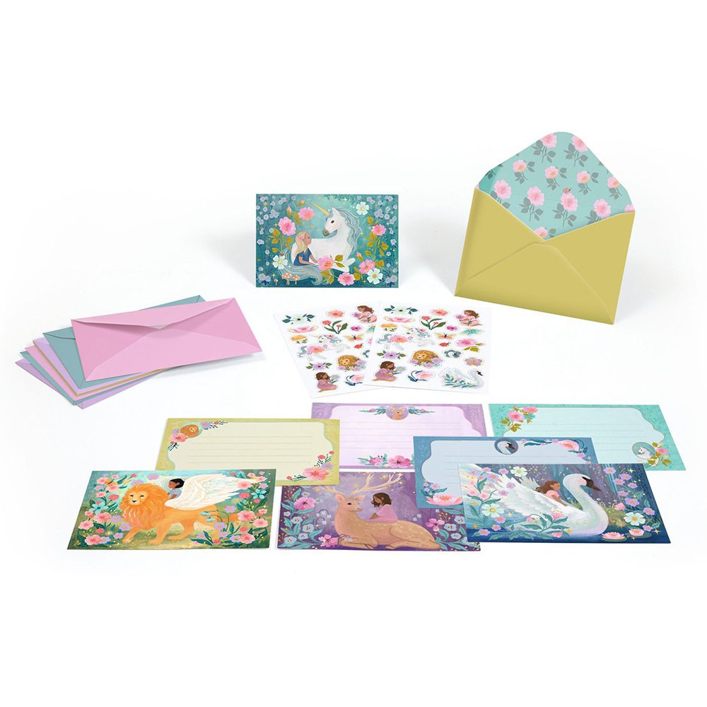 Σετ προσκλήσεων πάρτι από την εταιρεία Djeco, με θεματολογία φανταστικά ζώα, που δίνει σε κάθε γιορτή μια μαγική και παραμυθένια ατμόσφαιρα. Τα παιδιά μπορούν να γράψουν τα δικά τους μηνύματα σε 8 εικονογραφημένες κάρτες, να τις τοποθετήσουν σε πολύχρωμους φακέλους και να τις διακοσμήσουν με αυτοκόλλητα, δημιουργώντας πρωτότυπες και προσωποποιημένες προσκλήσεις. Ο συνδυασμός μεταλλικών λεπτομερειών με ματ εκτύπωση χαρίζει κομψότητα και πρωτοτυπία, ενώ το υψηλής ποιότητας χαρτί εξασφαλίζει ένα άψογο τελικό αποτέλεσμα. Περιεχόμενα συσκευασίας: 8 εικονογραφημένες κάρτες πρόσκλησης, 8 φακέλους και 2 φύλλα αυτοκόλλητων με θέμα φανταστικά ζώα. Όλα τα σχέδια διαθέτουν μεταλλικές λεπτομέρειες και ματ εκτύπωση.